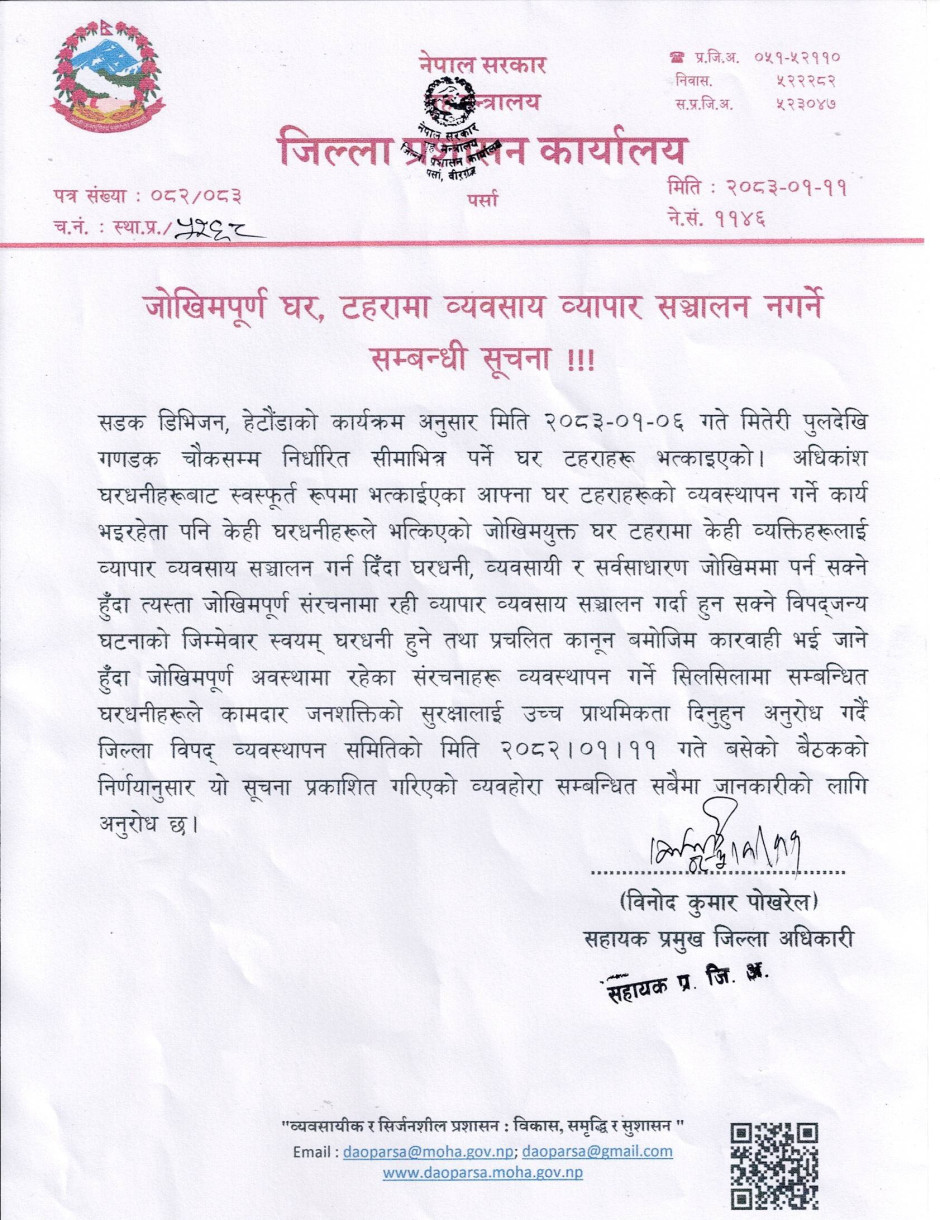 सडक डिभिजन, हेटौंडाको कार्यक्रम अनुसार मिति २०८३-०१-०६ गते मितेरी पुलदेखि गणडक चौकसम्म निर्धारित सीमाभित्र पर्ने घर टहराहरू भत्काइएको। अधिकांश घरधनीहरूबाट स्वस्फूर्त रूपमा भत्काईएका आफ्ना घर टहराहरूको व्यवस्थापन गर्ने कार्य भइरहेता पनि केही घरधनीहरूले भत्किएको जोखिमयुक्त घर टहरामा केही व्यक्तिहरूलाई व्यापार व्यवसाय सञ्चालन गर्न दिँदा घरधनी, व्यवसायी र सर्वसाधारण जोखिममा पर्न सक्ने हुँदा त्यस्ता जोखिमपूर्ण संरचनामा रही व्यापार व्यवसाय सञ्चालन गर्दा हुन सक्ने विपद्जन्य घटनाको जिम्मेवार स्वयम् घरधनी हुने तथा प्रचलित कानून बमोजिम कारवाही भई जाने हुँदा जोखिमपूर्ण अवस्थामा रहेका संरचनाहरू व्यवस्थापन गर्ने सिलसिलामा सम्बन्धित घरधनीहरूले कामदार जनशक्तिको सुरक्षालाई उच्च प्राथमिकता दिनुहुन अनुरोध गर्दै जिल्ला विपद् व्यवस्थापन समितिको मिति २०८२।०१।११ गते बसेको बैठकको निर्णयानुसार यो सूचना प्रकाशित गरिएको व्यवहोरा सम्बन्धित सबैमा जानकारीको लागि अनुरोध छ।