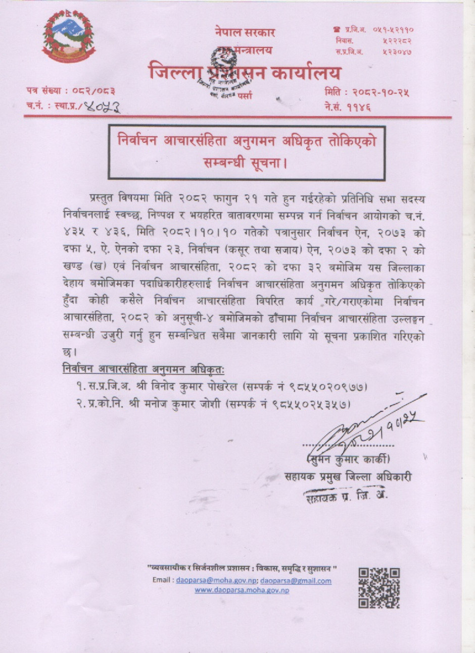 जिल्ला प्रशासन कार्यालय, पर्साको अत्यन्त जरुरी सूचना !