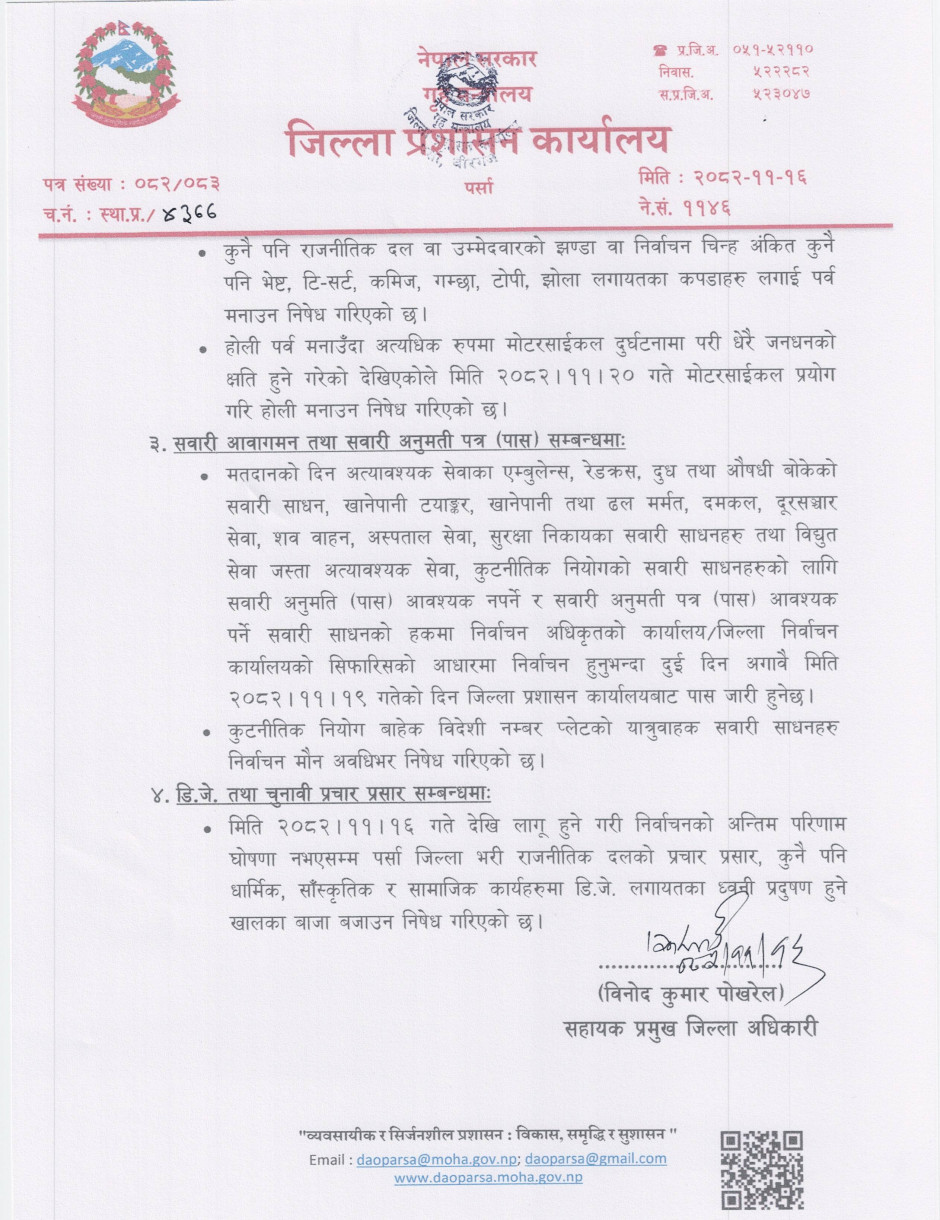 मिति २०८२ फागुन २१ गते हुन गईरहेको प्रतिनिधि सभा सदस्य निर्वाचनलाई स्वच्छ, निष्पक्ष र भयरहित वातावरणमा सम्पन्न गर्नका लागि जिल्लाको समग्र शान्ति सुरक्षालाई दृष्टिगत गरी निर्वाचन आयोग तथा गृह मन्त्रालयबाट प्राप्त निर्देशन, जिल्ला सुरक्षा समितिको निर्णय एवं मिति २०८२।११।१६ गते बसेको सर्वदलीय, सर्वपक्षीय बैंठकको निर्णय बमोजिम देहायको आदेश जारी गरिएको छ। यो आदेश बमोजिम गर्न गराउन हुन सम्बन्धित सबैमा अनुरोध गर्दै प्रस्तुत आदेशको पालना नगरेको पाईएमा प्रचलित कानून बमोजिम कारवाही भई जाने व्यहोरा समेत सबैको जानकारीको लागि निर्णयानुसार सूचित गरिन्छ।