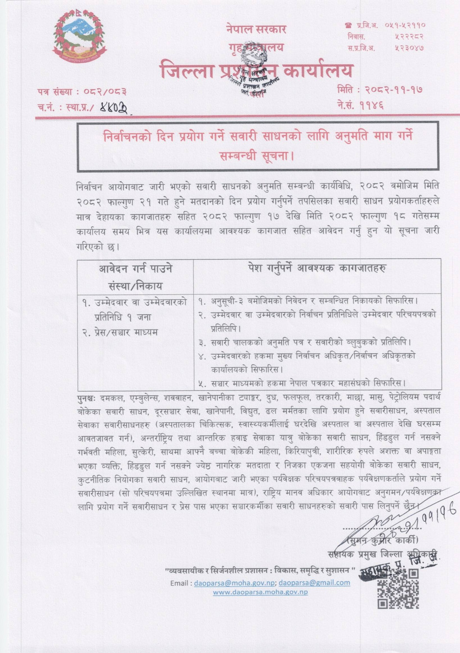 निर्वाचनको दिन प्रयोग गर्ने सवारी साधनको लागि अनुमति माग गर्ने सम्बन्धी सूचना।